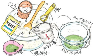 - In a large bowl, add flour, matcha powder, dry yeast, sugar, and lukewarm water and mix until it is all blended together. Then add salt. Knead the dough to a fine consistency. Wrap the bowl and let it sit at room temperature for 10 minutes.