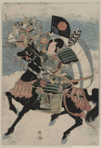 At the end of the men’s duel, the older man takes the boy’s head, which was the practice of the day when an opponent was prized (the boy’s clothing marked him as a prince). But after doing so, he finds a flute in the boy’s pack, and the Genji soldier realizes what he has done. He has killed the flutist whose skill he had admired before the battle, wafting from the opposing camp. Thereafter sickened by war, he quits to become a Buddhist monk. For this, the former soldier, Kumagai Naozane (1141-1208), is remembered to this day.