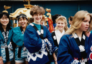 Yes, I grew up here in Seattle in a very diverse neighborhood on Capitol Hill. I went to Stevens, Meany, and Garfield if you are looking at the public school pattern. My kids are now in that same pattern, which is very gratifying for me. My family spoke German growing up, but I had friends at school speaking Japanese, Chinese, Korean. I was very interested in Asia. My parents were very strong proponents of learning, being international, being an exchange student. When it became my turn to be an exchange student, I said, I don’t want to go to Europe. That’s where my parents were. I was very focused on Asia. I went on the AFS program in high school. I graduated from Garfield early and lived in a rice-farming village in Hiroshima Prefecture. My Hiroshima high school year was very transformative for me. I was the first exchange student that they had ever had. That was 1988. All the teachers were excited to have me learn Japanese. I was in a three-generational farm family way up in the mountains. It took an hour and a half to get to school by bike, bus, and train. I came out of that year writing and reading at a middle-school level. That jump-started me for college. I went to Pomona College down in the Los Angeles area, lived in the international dorm, was an Asian Studies major focused on Japanese history and literature. I spent another year at Doshisha University in Kyoto, lived with another family for a year. That immersion was awesome for my language skills. When I finished up after those two years and three years of college at Pomona, I applied for JET (the Japan Exchange and Teaching Programme) as a coordinator for international relations. Kobe City was looking for someone from Seattle who spoke an additional language. I fit (their criteria) so I got the assignment.