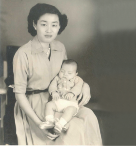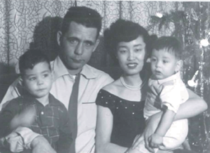In 1950, they got married at the U.S. Consulate General of Kobe and conceived their oldest son, Ray the following year. She was required to go to the American military hospital to give birth to the child, but they had not made it in time to be admitted and ended up having the baby in Etajima. In March of 1952, Narachiyo, with her newborn son, Ray, in tow, set off for America with Pete on a naval ship from Yokohama.