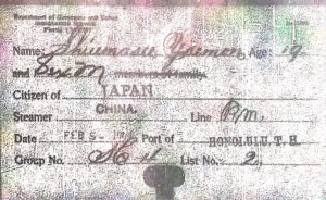 Yoemon went to Hawaii at age 19 in January 1904. He migrated to Hawaii to help his family out of poverty. He took a minimum amount of necessities and got on a small boat to Kobe from Kamai, as his father Jinzou saw him off. He got on an official ship in Kobe and headed to Hawaii. Traveling by ship back in the days was truly harsh. The ship cabin was small, the sea in the Pacific got rough sometimes, the ship swayed violently, and many people became awfully seasick.