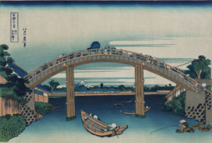 Second, in the early 1830s, woodblock artist Katsushika Hokusai included Fukagawa’s Mannen Bridge in his famous set of woodblock prints, “Thirty-Six Views of Mount Fuji.” Mannen is Japanese for 10,000 years.