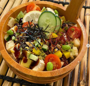 While it’s easy to fill up on sushi at Momiji, be sure to save room for some izakaya items as well. Vegan-friendly non-sushi items include salads, tomato or ginger tofu, enoki, shishito, or portabella yaki (ask for no butter), and yasai tenzaru.