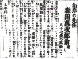 “Manjiro Morita died of pneumonia at Columbia Hospital yesterday at the age of 87. He was born on May 15, 1851 in Hyogo Prefecture. He first came to the United States in 1873, but because he did not have a passport, he was repatriated shortly after landing and served as an interpreter for the Hawaiian dynasty for a while.