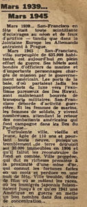 Occasional mentions continued to appear during the later years of the war, notably after the liberation of Paris in August 1944. On March 18, 1945, “Paris-Presse” featured an article about the city of San Francisco. Although dubbing it “one of the most beautiful cities in the world,” the article noted it as “a troubled city, where various races lived and where Japanese immigrants lived at one point until the start of war in 1941, when the United States sent the community to a number of concentration camps.”