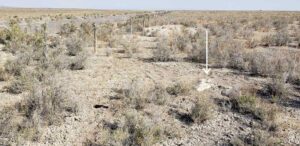 From the guard-tower location, we used a 300-foot-long measuring tape to count out 943½ feet toward the north, along the security fence… But our caution and care were superfluous: the site of Mr. Wakasa’s murder is still marked by a large stone lying flat on the ground and concrete pieces, located about 929 feet north of our starting location and twelve feet east of the fence. The discrepancy between our 929-foot distance and George Shimamoto’s 943½-foot distance could be due to differences in measurement methods: Shimamoto likely would have used a distance-measuring wheel, less precise than a tape. It is also possible that the landscape crew built the monument slightly away from the spot Wakasa died when they placed it two months after the shooting.