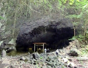 One of the caves is closed to the pubic; its entrance is visible from a shrine on the opposing valley wall. A second nearby cave is popular with Japanese visitors (article, “Visit the mythical cave that hid the Sun Goddess in Japanese mythology,” SoraNews24.com, Sept. 2022).