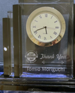 Next, staff, volunteers and board members took the stage and presented Tomio with a surprise award: an engraved clock thanking him for his decades of service and leadership to the newspapers.
