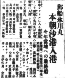 “On Hikawa-maru which arrived in port this morning were Yoshinori Otsuka (Oji Paper Co.), Hisae Takahara (Lieutenant Commander of Kure, a city near Hiroshima), Yuji Yamada (Mitsui & Co., Ltd.) and others.”