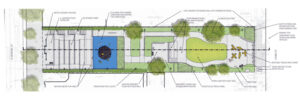 Ground was broken for a new New LIttle Saigon Park on July 6. The park will run the full width of the block between S Jackson and S King Streets, immediately east of the Nisei Veterans Hall parking lot. The park will open in early 2024 and will include, from left, a seating area, a play area and open lawn.