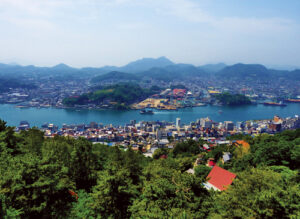Innoshima is now part of Onomichi, a beautiful town on the mainland of Honshu, known as the gateway to Seto Inland Sea. The area has a Mediterranean feel. Lemons and flowers are grown there. Onomichi is also famous as a cinema center. Many Japanese movies—notably, Ozu’s “Tokyo Story” (1953)— have been partly filmed there. On weekends, the hotels are packed with bicyclists who go island-hopping by bridge or ferry across the Sea, 60 km (37 miles) to Imabari, Shikoku, on its southern shore.