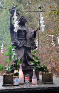 Scenes from Tsubaki Grand Shrine of America, which adjoins the Pilchuck River, Jan. 1. Ame-no-Uzume-no-Mikoto dances below at second left. It was her enchanting performance that drew the sun goddess Amaterasu from her cave, restoring light to the world in Japanese mythology (“The Caves of Amaterasu,” napost.com, Dec. 15, 2022; tsubaki.org).