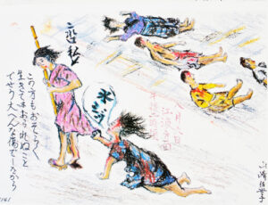 Reading right to left: (1) observer’s name, Yamasaki or Yamazaki Sayoko(?), (2) the date, location and time in red (hachi-gatsu muika, Eba-houmen, gogo niji goro); (3) the person on the ground crying “mizu MIZU” (written in the old way, “MIDU”); (4) “Kore wa watashi” above a pointing arrow, and her thoughts: (5) “Kono kata mo osoraku ikitewa orarenu koto deseu (old way of writing “deshou”), taihenna kizu deshita kara.” Translations are (2) “August 6, in the direction of Eba, about 2 p.m.”; (3) Water WATER (4) “This is me;” (5) “I believe this person also did not make it. The injury looked too severe.” Translation: Hikari Kono