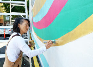 ON JUNE 25, Erin Shigaki repainted much of her University District mural of UW Nisei to repair damage from graffiti and weather.