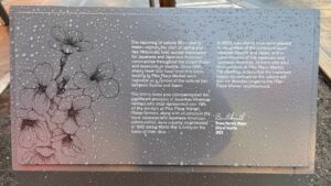 A small plaque across the street from the entrance of Pike Place Market honors the planting of eight new cherry trees along Pike Street.