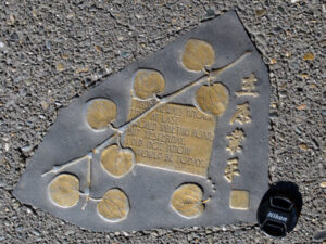 I also noticed clues to the poem’s origins. First, the worn surface of the brass artwork suggests that it has been there for some time. My guess is that it is an early “One Percent for Art” project, an ordinance to introduce art to city-improvement projects. As that project began in 1973, fifty years might be enough time for the bronze metalwork to achieve its current scuffed look.