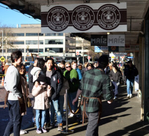First, however, let me set the scene with my third photo of the morning. It is of people lining the sidewalk to get into the first Starbucks store, where I have been told they sell omiyage marked as such. The patient shoppers are likely tourists because no Seattle person would wait in such a line for Starbucks merchandise when branch stores are all over town. In retrospect, I should have walked closer to the line to see what languages they were speaking — to see if any were from Japan. In my pre-COVID-19 tour guide days, this is one of the destinations I would point out to such travelers on my tours.