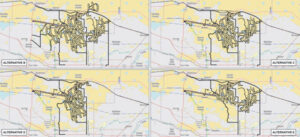 Maps from the DEIS Executive Summary. Above: Alternative B, Proposed Action. The black “worms” are wind turbine rows; heavy black lines are associated infrastructure. Orange shading denotes Bureau of Land Management land. The Minidoka National Historic Site is marked here by red rectangles. Scale: The background checkerboard demarcates surveyed square miles. The town at lower left is Twin Falls. Middle: Plan B in comparison with C, D, and E, which involve installing up to 400, 378, 280, and 269 wind turbines, respectively. https://eplanning.blm.gov/eplanning-ui/project/2013782/570