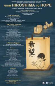 ▪️“FROM HIROSHIMA TO HOPE” Lanterns light at Green Lake for hope and peace. Tue, Aug 6, at 6pm at Green Lake, Northwest shore, near Seattle Public Theater at the Bathhouse, 7312 West Green Lake Dr. N, Seattle, WA 98103.
