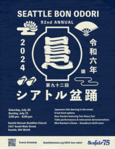 ▪️92 nd Bon Odori (Japanese folk dance), Sat.-Sun., Jul. 20-21st, 2 – 8 p.m. at Betsuin Buddhist Temple, 1427 S Main St, Seattle. https://seattlebetsuin.com/2024-obon.