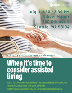 ▪️When It’s Time to Consider Assisted Living, Thu., Jul. 11th, 1;30 – 3:30 p.m., Nikkei Manor, 700 Sixth Ave., S, Seattle. Kokoro Kai’s Conversation Cafe series: Join us for a seminar from Nikkei Manor’s Marketing and Sales Director Thomas Papastavrou. It is a conversation with peers and bento! RSVP to Tomoko Faasuamalie 206-726-6474 or tfaasuamalie@keironw.org.