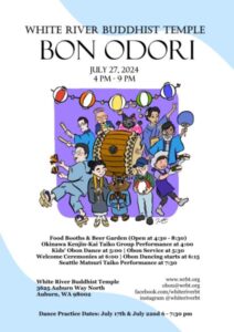 ▪️White River Buddhist Temple Bon Odori, Jul. 27th , 4 – 9 p.m., 3625 Auburn Way N, Auburn. Dancing, taiko, performances, food booths, beer garden. For more information, see: https://www.wrbt.org.