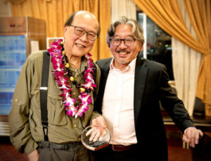 ▲Right: Author and artist Alan Lau (l) poses with emcee Harold Taniguchi. The fourth Golden Circle Award went to the Department of American Ethnic Studies at the University of Washington. Photos courtesy of Tom Trudnowski