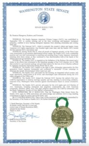 Seattle JACL thanked the Washington State Senate for this high recognition. The resolution honored the Seattle JACL Chapter, the entire JACL, and, morever, the past visionary leaders who built the JA legacy of the past. The current visionary leaders and youth are creating the JA legacy for the future.