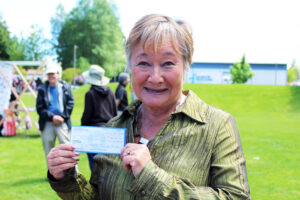 ▲ Rita Brogan holding the first check received for the sculpture campaign.
