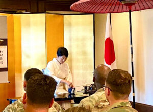 ▼ Kyoko Matsuda demonstrating the tea ceremony for U.S. Army guests at the Consul General of Japan in Seattle’s official residence. Photo credit: Devin Michaels.