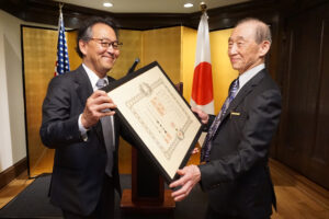 ▲Con. Gen. Iyori presenting the award to Shiro Kashiba. Photo credit : Dan Cunnen.