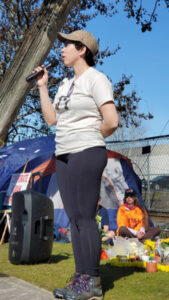 ◀︎ Tsuru for Solidarity organizer Becca Asaki speaking outside the detention center. Photo credit: Kiku Hughes.