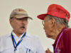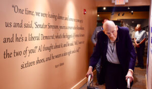 ▲Former U.S. Senator Alan Simpson tours the new exhibit about his and the late Norman Mineta’s life and public careers. Photo credit: Heart Mountain Wyoming Foundation.