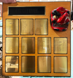 The Tengu Club awarded winners of its annual winter fishing derby by engraving their names on this plaque. ▶︎