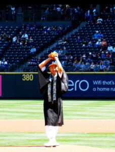 ◀︎ Rev. Kusunoki winds up for the ceremonial first pitch at the Seattle Mariners game.