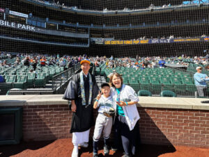 Rev. Kusunoki, son Yuiya, and wife Ayano inside the baseball field at home base before the Seattle Mariners game on August 25th. Photo credit: Alex Sakamoto.