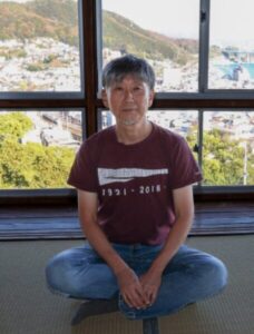 ▲Hideo Makihara sits in his Miharashi-tei guesthouse, located in Onomichi City, Hiroshima Prefecture.
