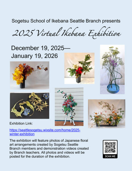 Sogetsu Seattle Virtual Exhibition – Now-Jan19. Viewers can see free-flowing works unconstrained by convention and individuality from 2012 onward. See website at: https://seattlesogetsu.wixsite.com/home/2025-winter-exhibition.