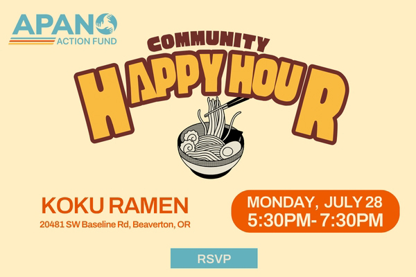 APANO Community Happy Hour – Mon, Jul 28; 5:30 – 7:30 P.M. Koku Ramen, 20481 SW Baseline Rd, Portland. Connect with other Asian Pacific American Network of Oregon members about the issues that matter to you. Learn how to get involved in local and state politics! Questions? E-mail: contact@apano.org or telephone: 971-340-4861. RSVP at: https://secure.everyaction.com/B4l08l4_FkqLK-rmEqo92A2?emci=59d58bb1-4263-f011-8dc9-6045bdfe8e9 c&emdi=7e6f1bd0-4363 -f011-8dc9-6045bdfe8e9c&ceid=1408 6033.