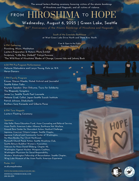 From Hiroshima to Hope: Lantern Floating Ceremony – Wed, Aug 6; 6–8 p.m. W. Green Lake Dr. N. & Stone Ave. N., Seattle. Free. Donations welcome. Honoring victims of the Hiroshima and Nagasaki atomic bom bings in Japan.