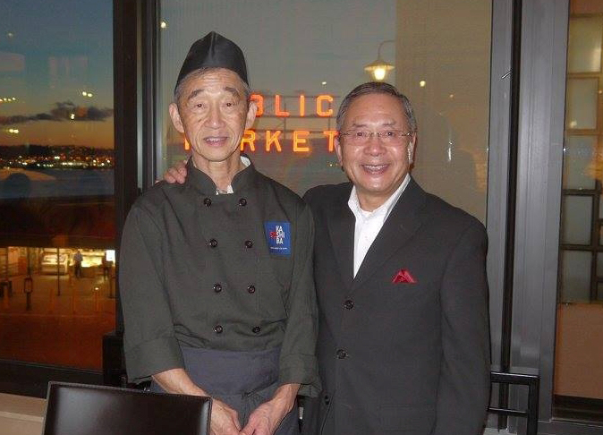 Shiro Kashiba and Sam Takahashi at the grand opening of Sushi Kashiba restaurant in Seattle, Washington, 2015. Photo courtesy: Sam Takahashi.