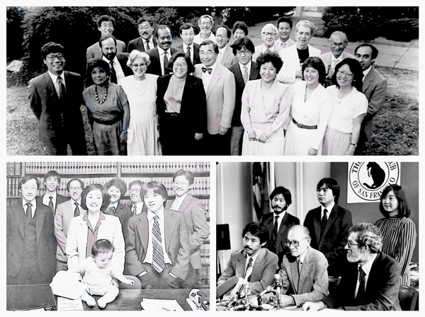 Bottom left: Hirabayashi team with lead attorney Kathryn Bannai, 1985. Photo credit: Stan Shikuma. Bottom right: Korematsu team with team member attorney Lorraine Bannai, 1983. Photo credit: Crystal Huie.