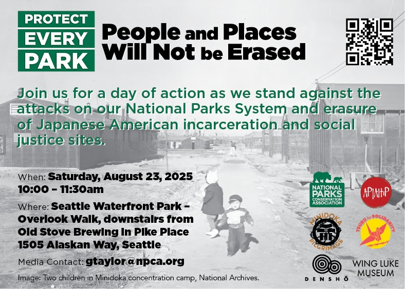Our event will place special emphasis on the five designated park sites where Japanese Americans were incarcerated: Manzanar, Minidoka, Tule Lake, Amache and Honouliuli National Historic Site. Just across the water, Bainbridge Island was the first place Japanese Americans were forcibly removed from their homes and sent to confinement sites that are now at risk of erasure. America must not risk repeating its mistakes by censoring the lessons taught by these sites.