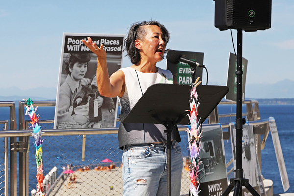 Erin Shigaki, representing Tsuru for Solidarity, was one of the speakers during the Protect Every Park gathering at the Seattle Waterfront Park in August. Other speakers included Bainbridge Island City Council, and Asian & Pacific Islander Americans in Historic Preservation. Cancelling park funding and rescinding grants to historical and cultural preservation organizations are efforts to erase important stories, including former World War II incarceration camps (1945–1948). In solidarity, participants urged Congress to protect every park—large and small. The event, sponsored by the National Parks Conservation Association and supported by the Wing Luke Museum, also took place across the U.S.