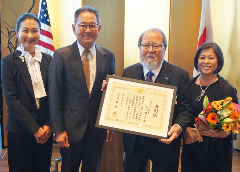 Left to right: Yuko Iyori, Con. Gen. Makoto Iyori, Steve Sumida holding his commendation, and Gail Nomura holding flowers. Photo credit: Consulate-General of Japan in Seattle.