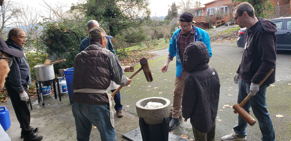 Volunteers preparing the rice for visitors to pound into a mochi mass. Photo credit: Barbara Mizoguchi.