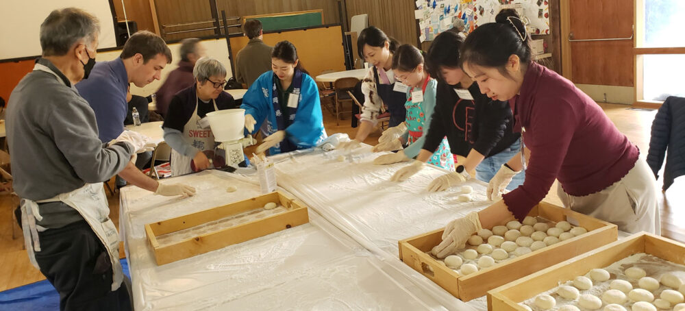 Volunteers rolling and preparing the mochi. Photo credit: Barbara Mizoguchi.