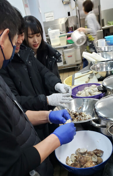 Volunteer young people preparing sato imo (Japanese taro) in the kitchen. Photo credit: Barbara Mizoguchi.