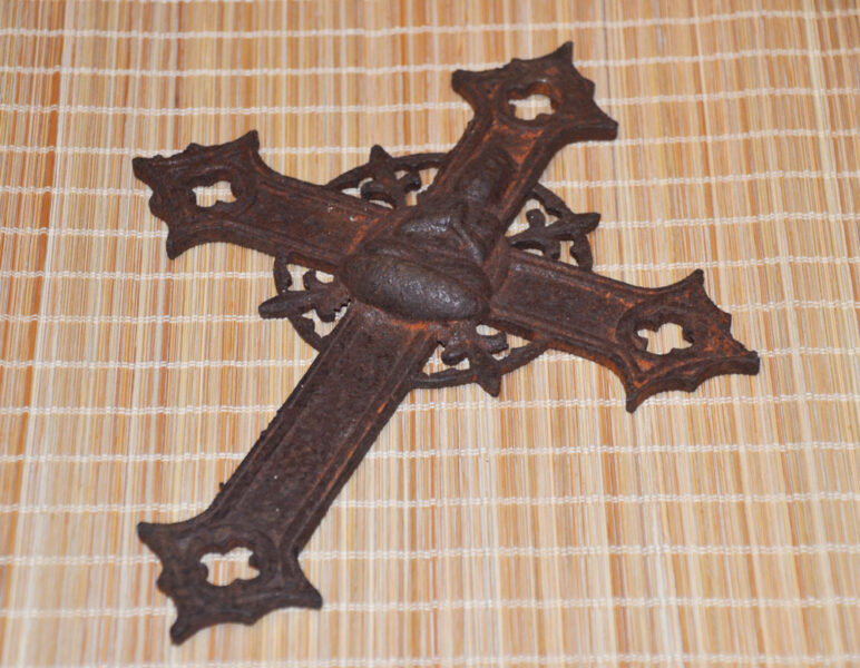 Metal cross with a Buddha in the center. Date unknown. On loan by Mutsuko Okada. Photo courtesy: David Yamaguchi.