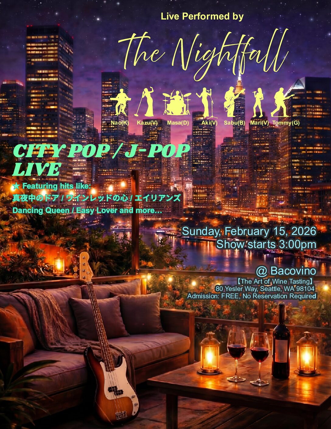 Baco Vino Wine Tasting Bar 80 Yesler Way, SeattleThe acclaimed Japanese seven-member band 9PM, celebrated for their standout performances last summer, returns under a new name, The Nightfall. Set within the intimate ambiance of Bacovino, a wine-tasting bar on Seattle’s waterfront, this special live performance offers a graceful pairing of beloved J-POP and city pop classics, all enjoyed in a relaxed yet sophisticated […]